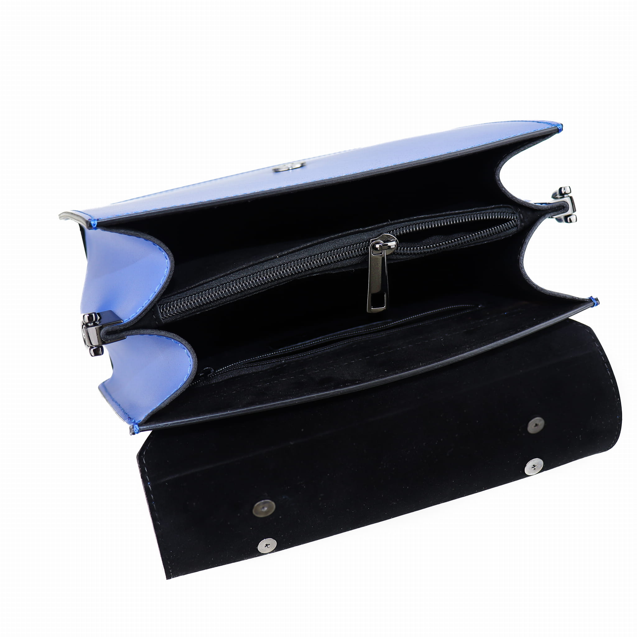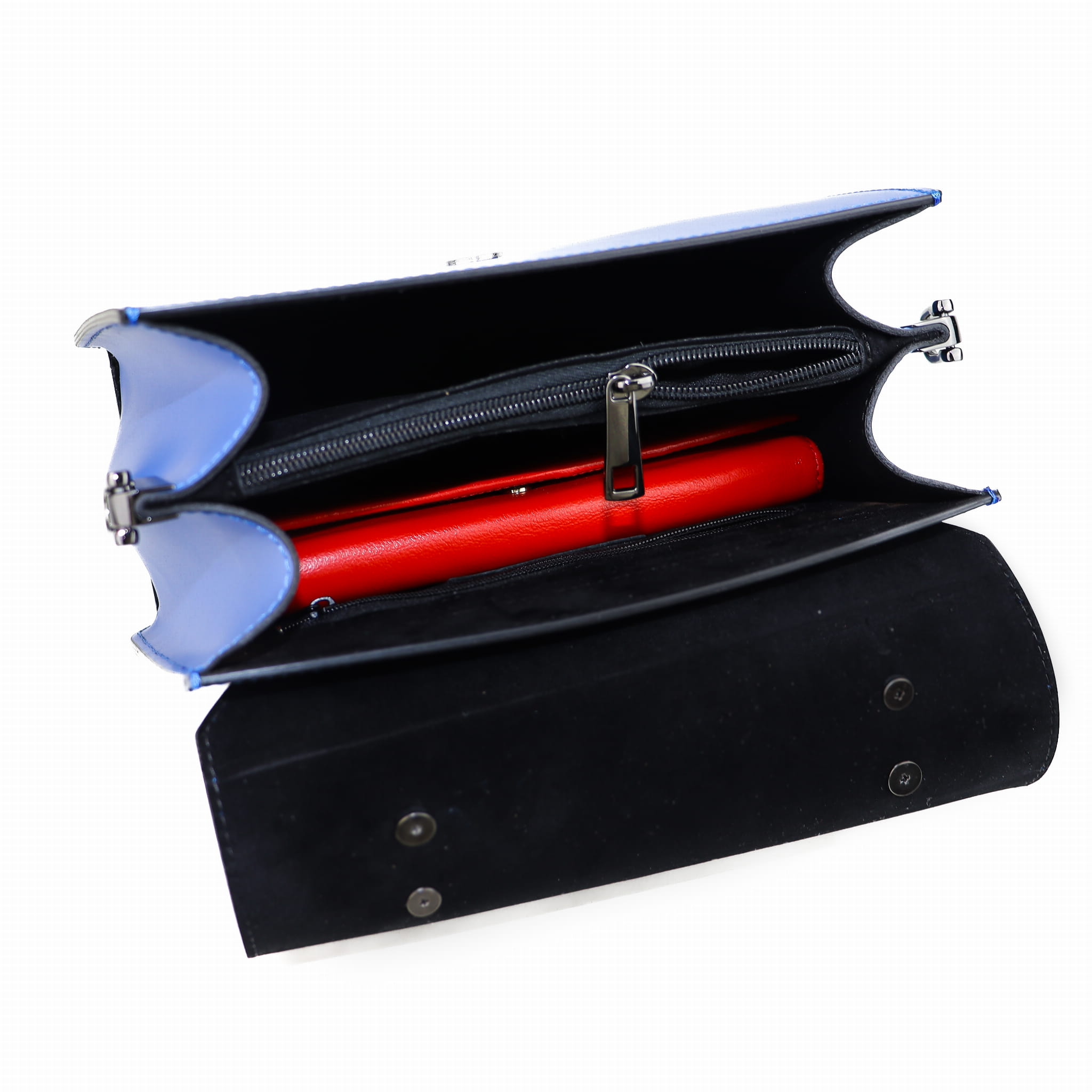 - Obecny model skórzany posiada dwie komury wewnątrz, wyposażone w przegrodę zapinaną na zamek oraz dwie kieszonki na karty.