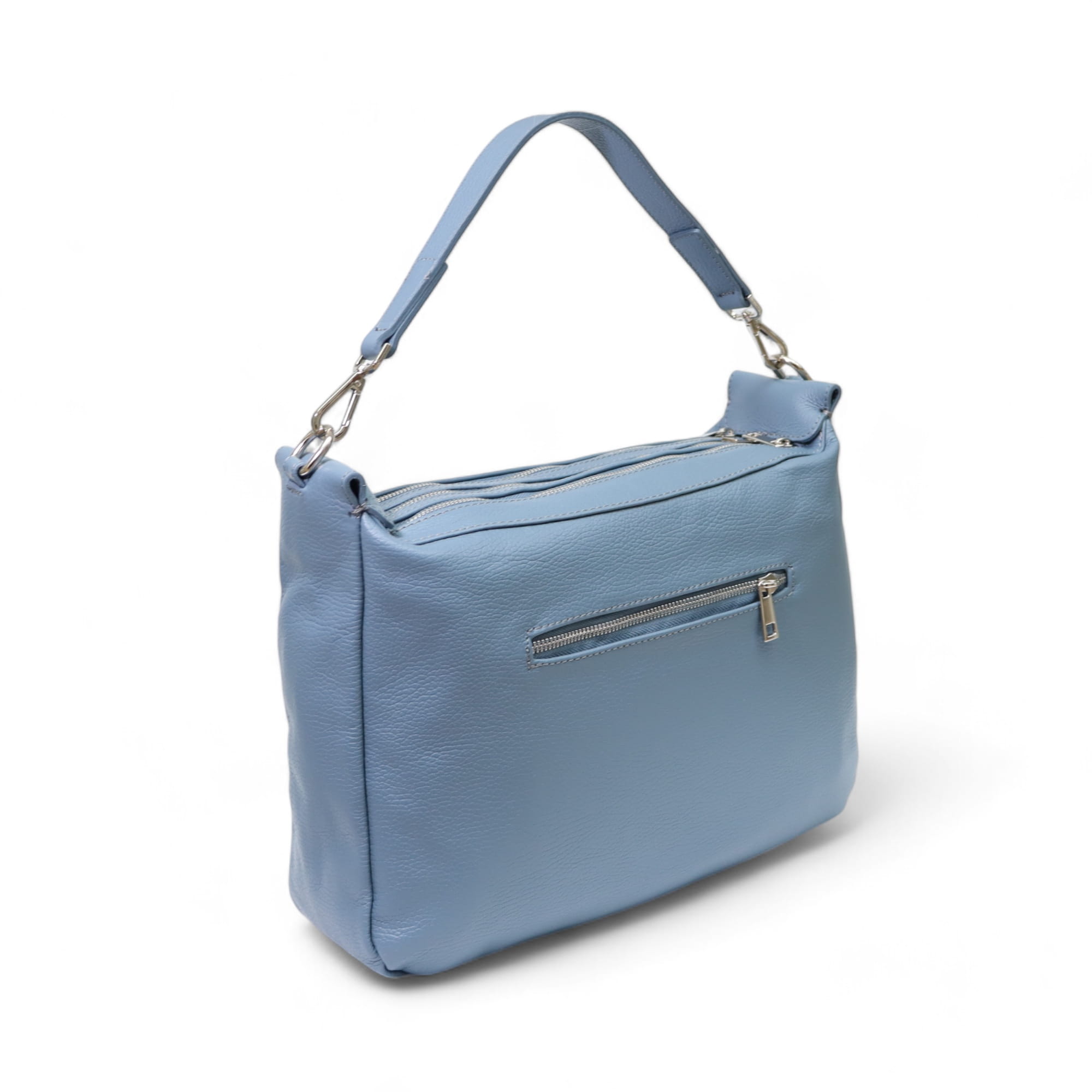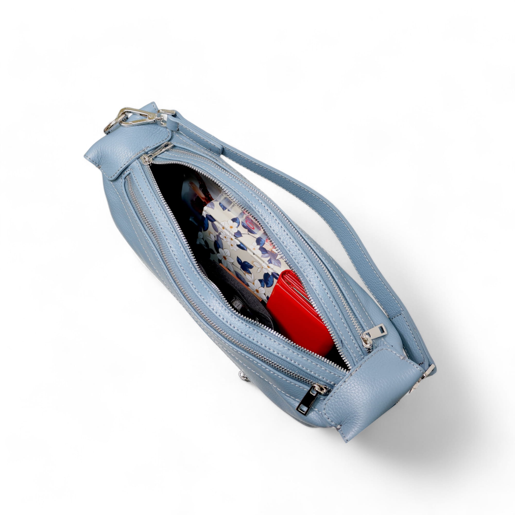 - Dwie dodatkowe otwarte kieszonki na telefon oraz jedną zamykaną na suwak w komorze głównej.