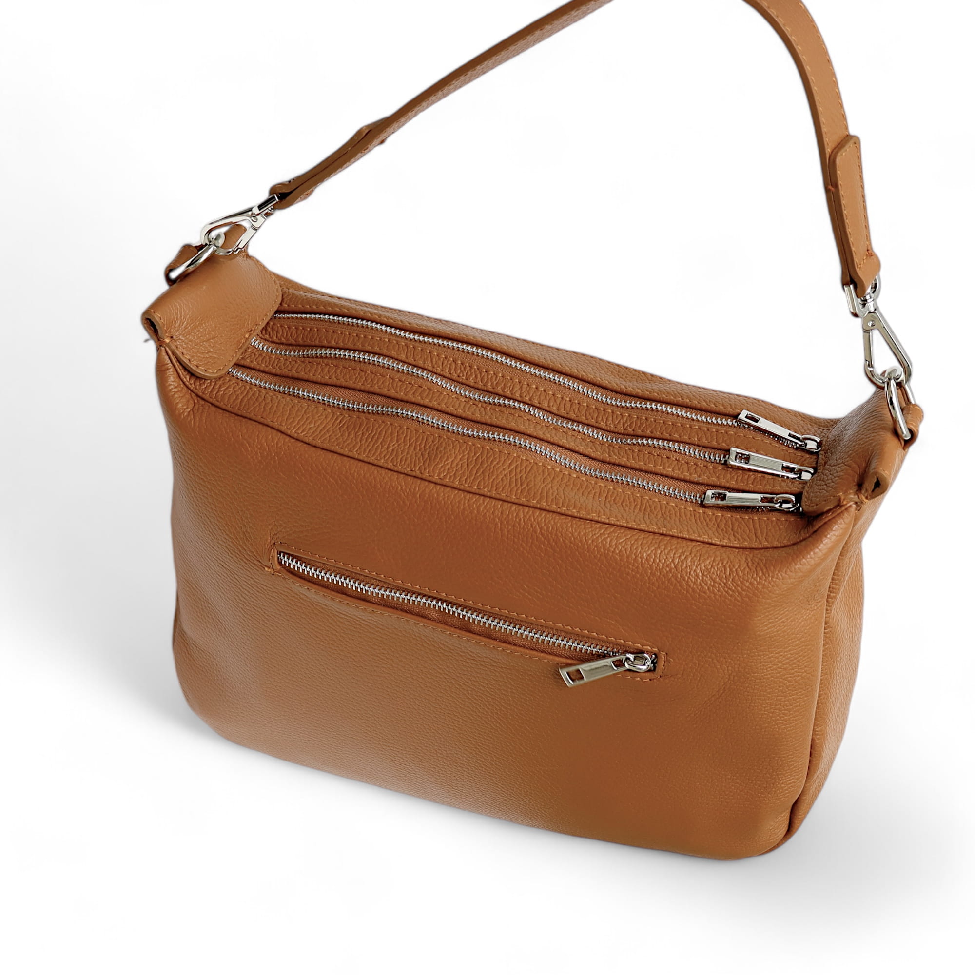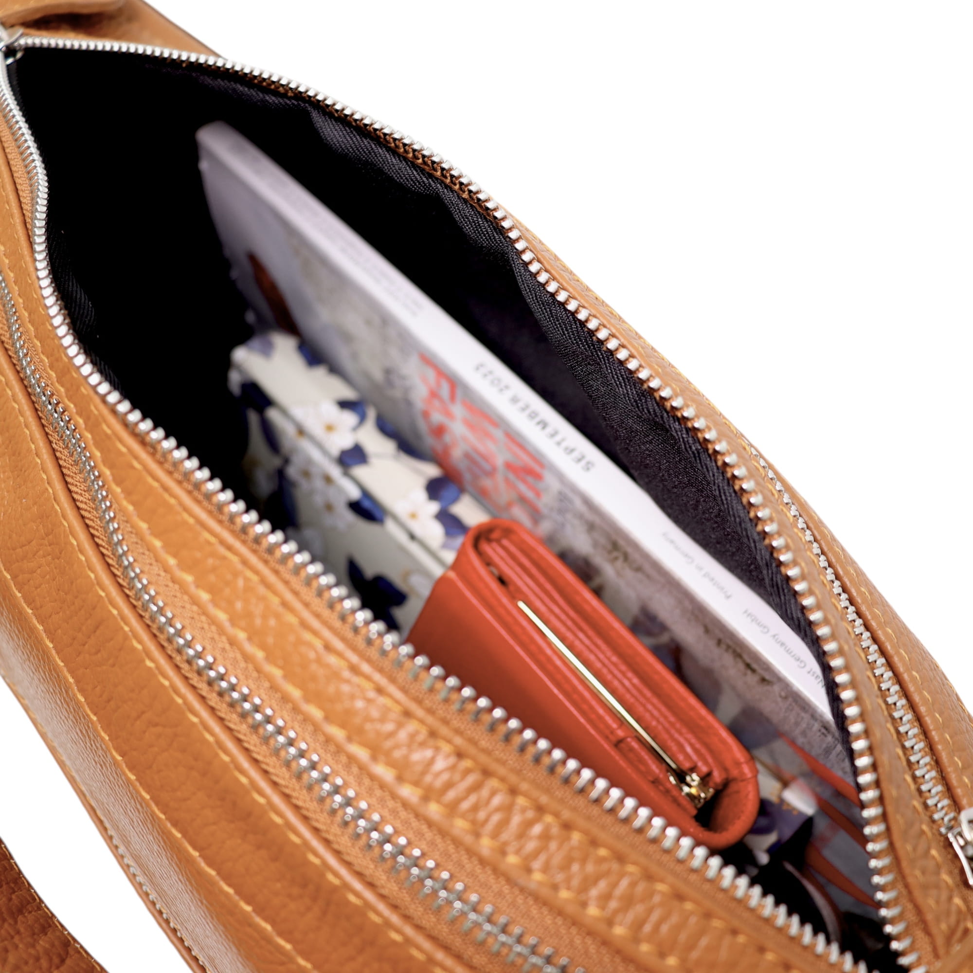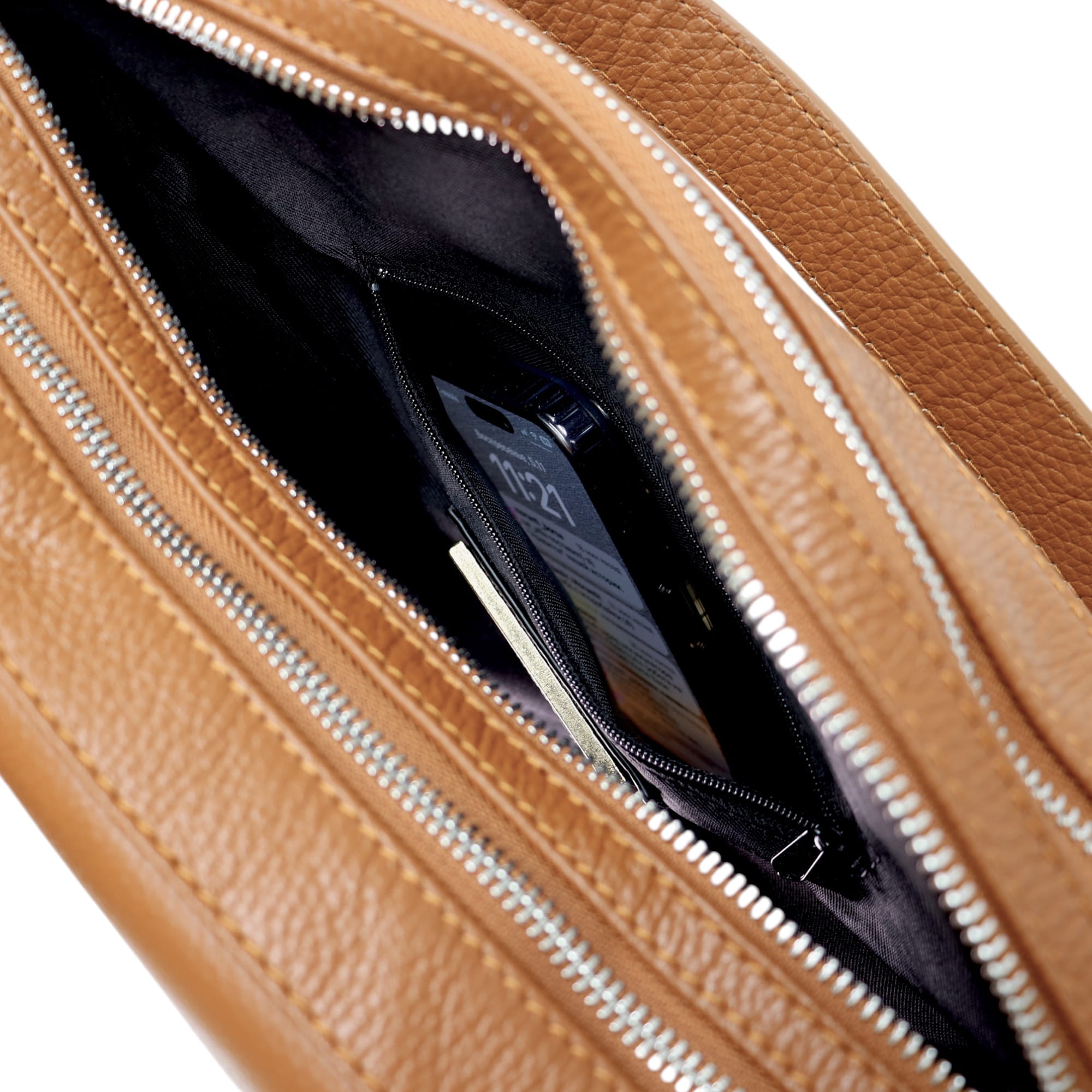 - Dwie dodatkowe otwarte kieszonki na telefon oraz jedną zamykaną na suwak w komorze głównej.