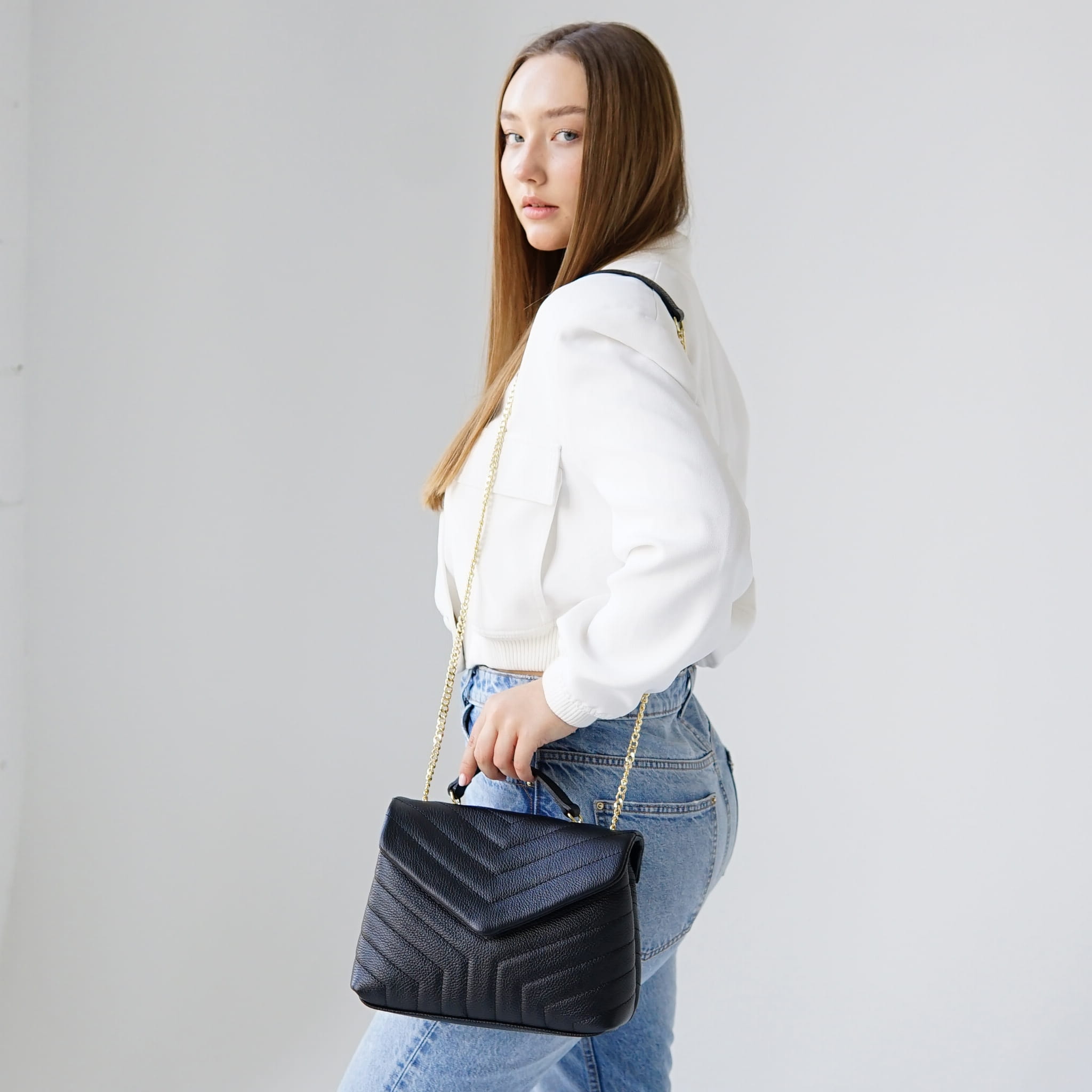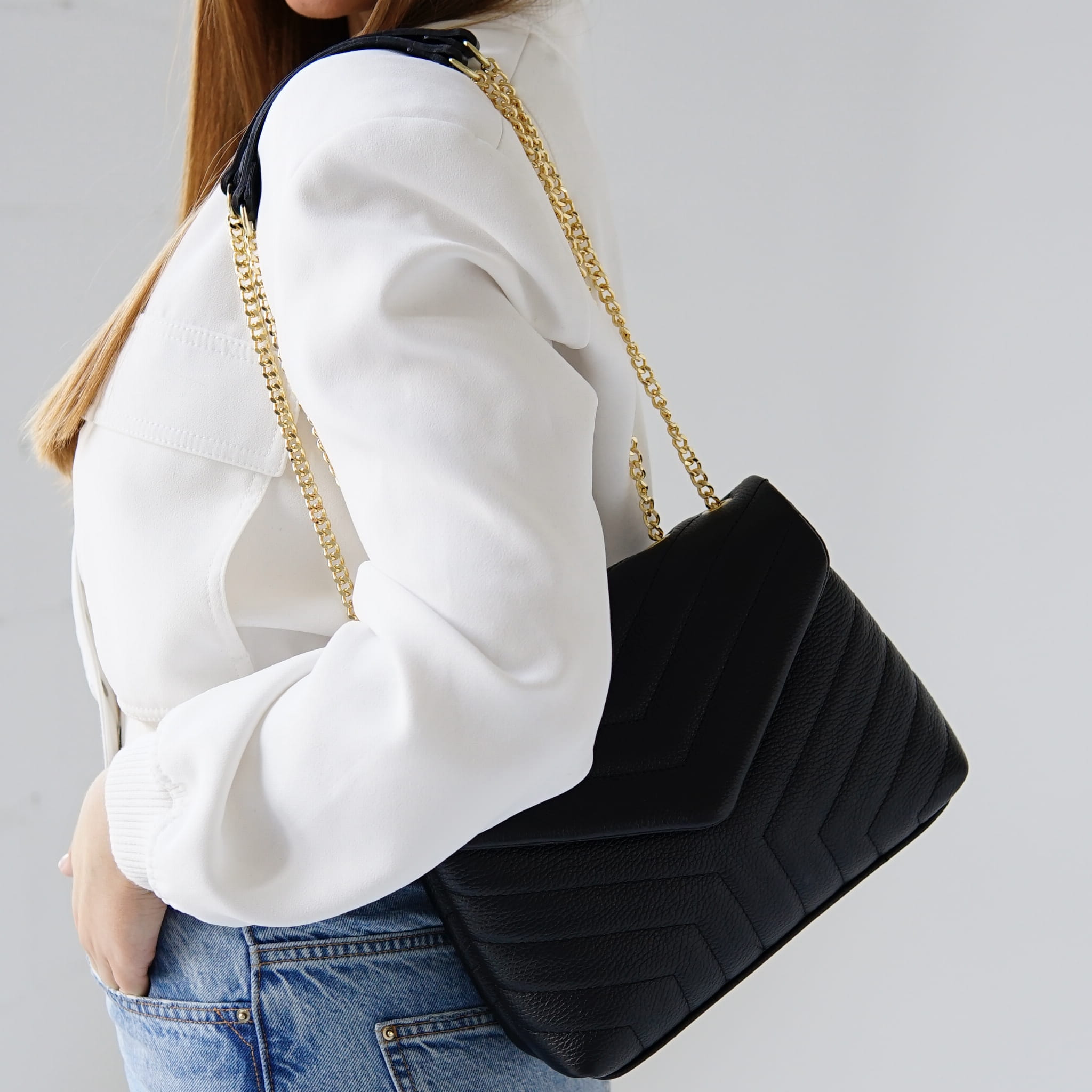 - Torebkę można nosić na ramię i przez ramię, ma dodatkowy pasek łańcuszek.