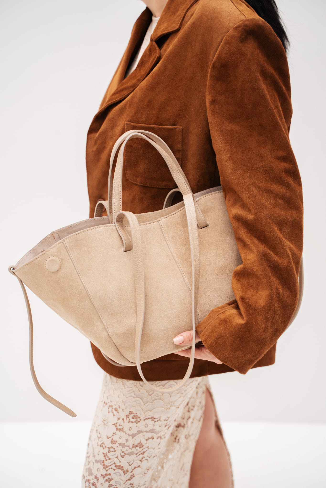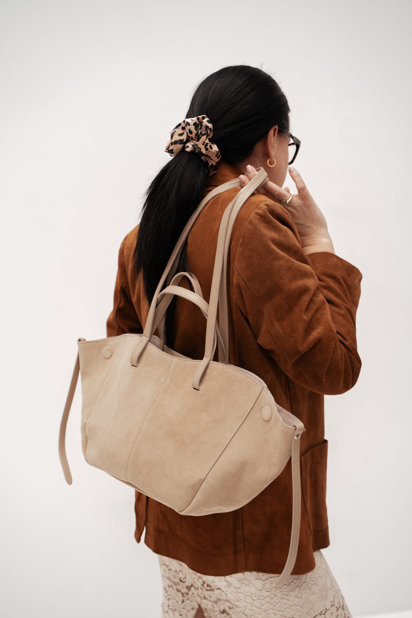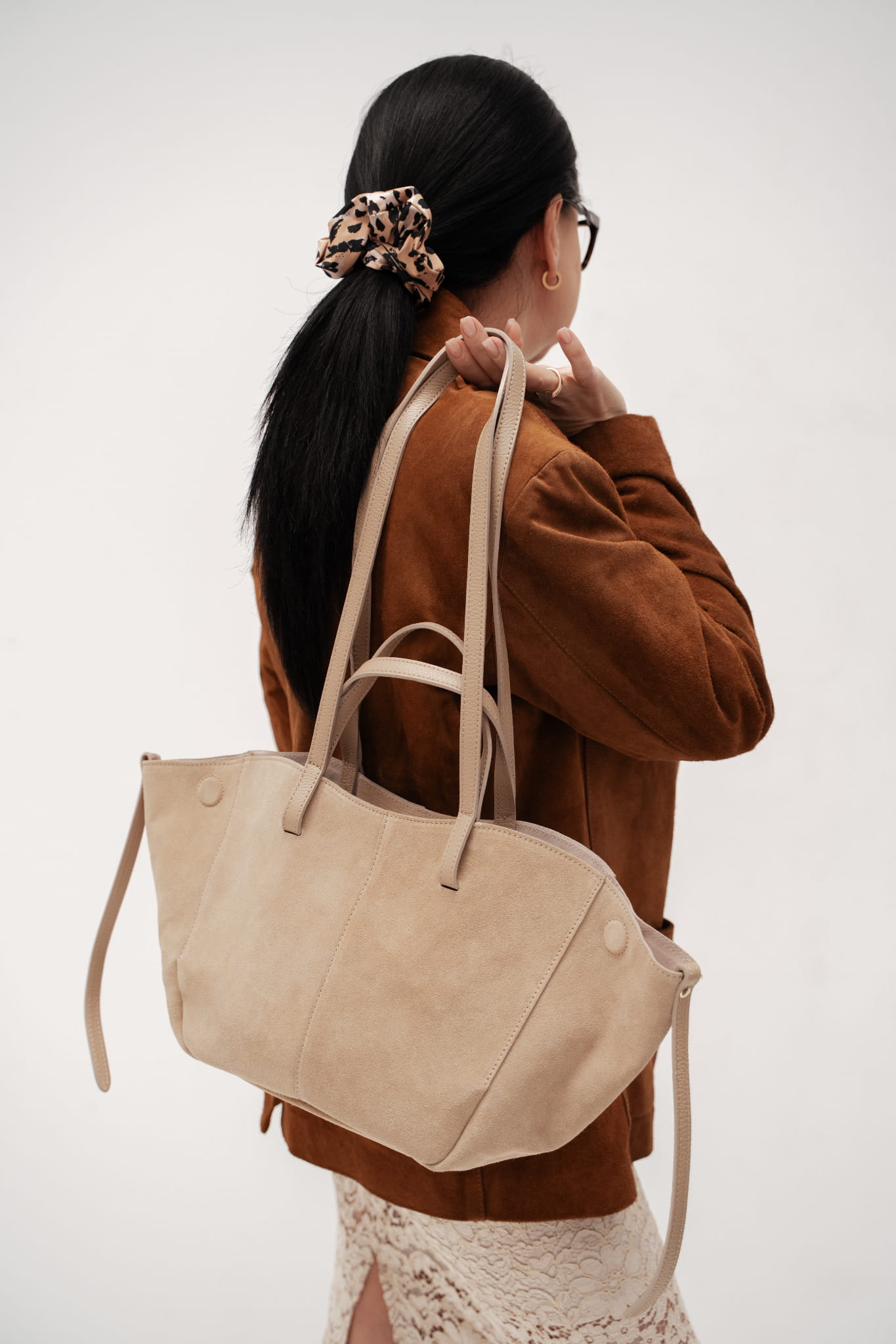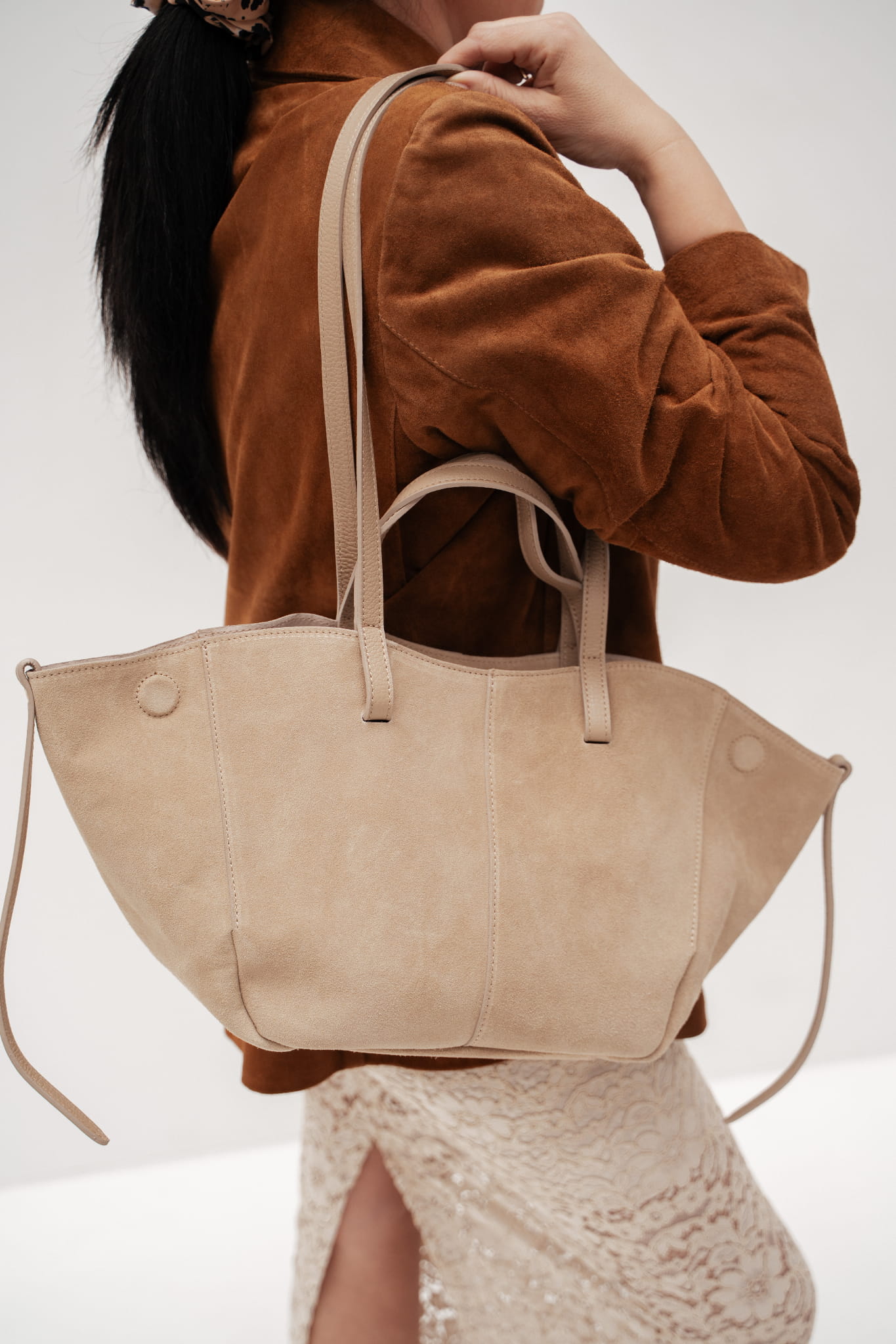 • Torebka zmienia kształt w zależności od potrzeb — rozszerz bok dla większej pojemności albo ściśnij, by wyglądała bardziej kompaktowo.
