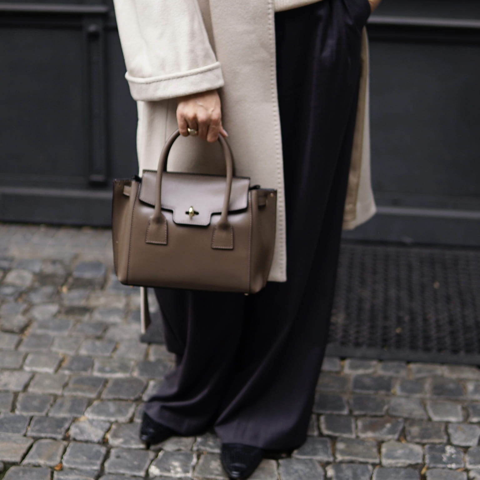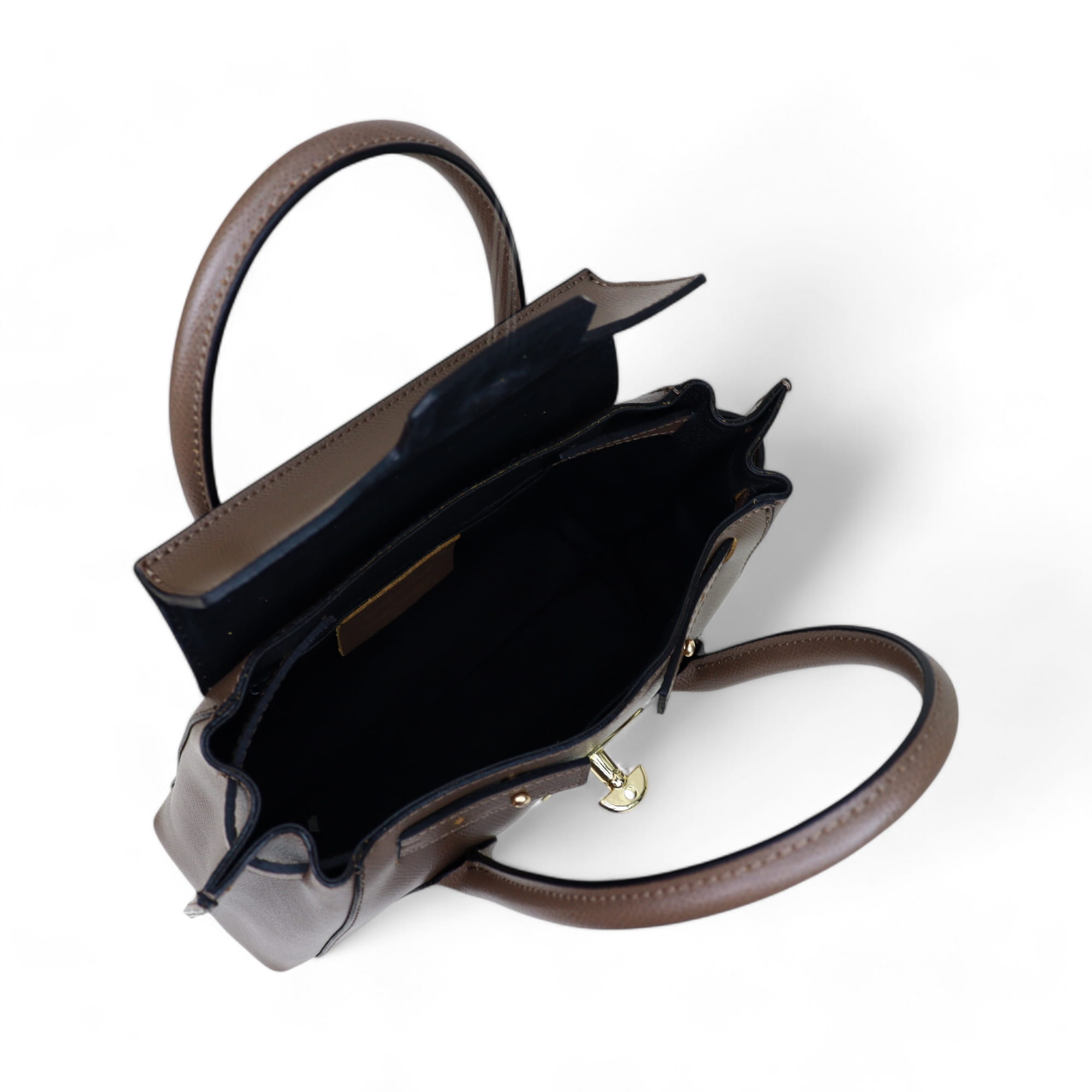 Dwa skórzane uchwyty do noszenia torby w ręku.