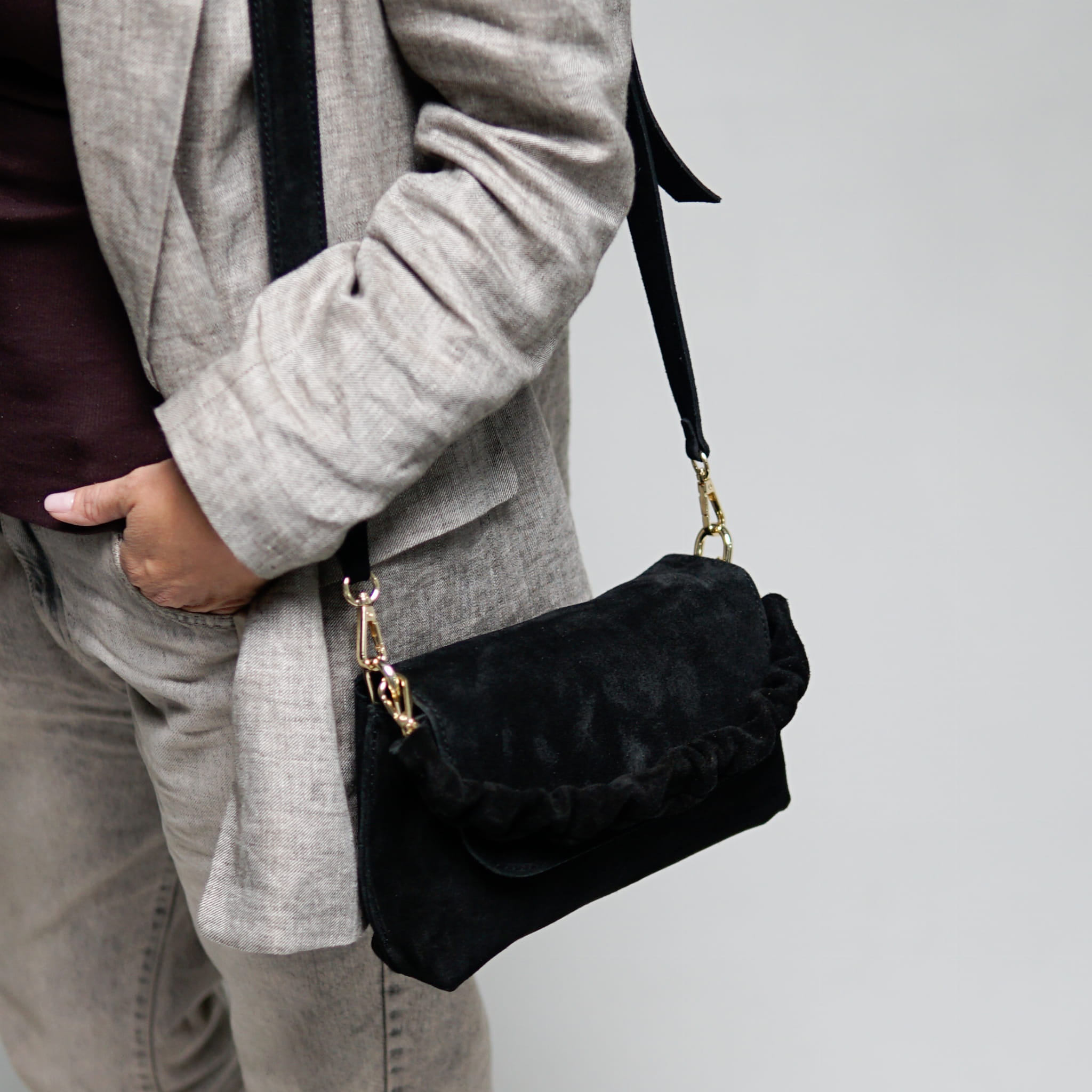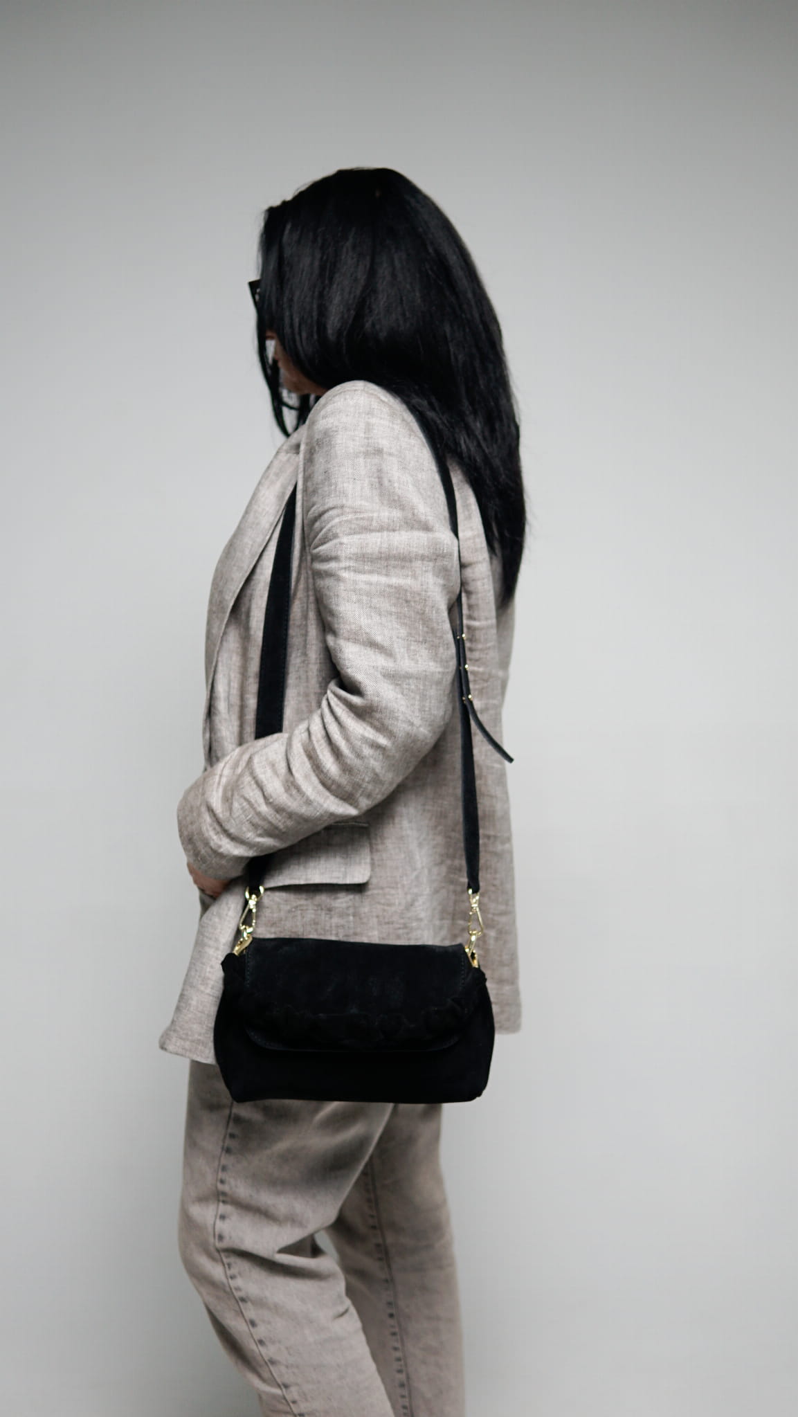 - Mieści duży portfel, okulary, telefon.