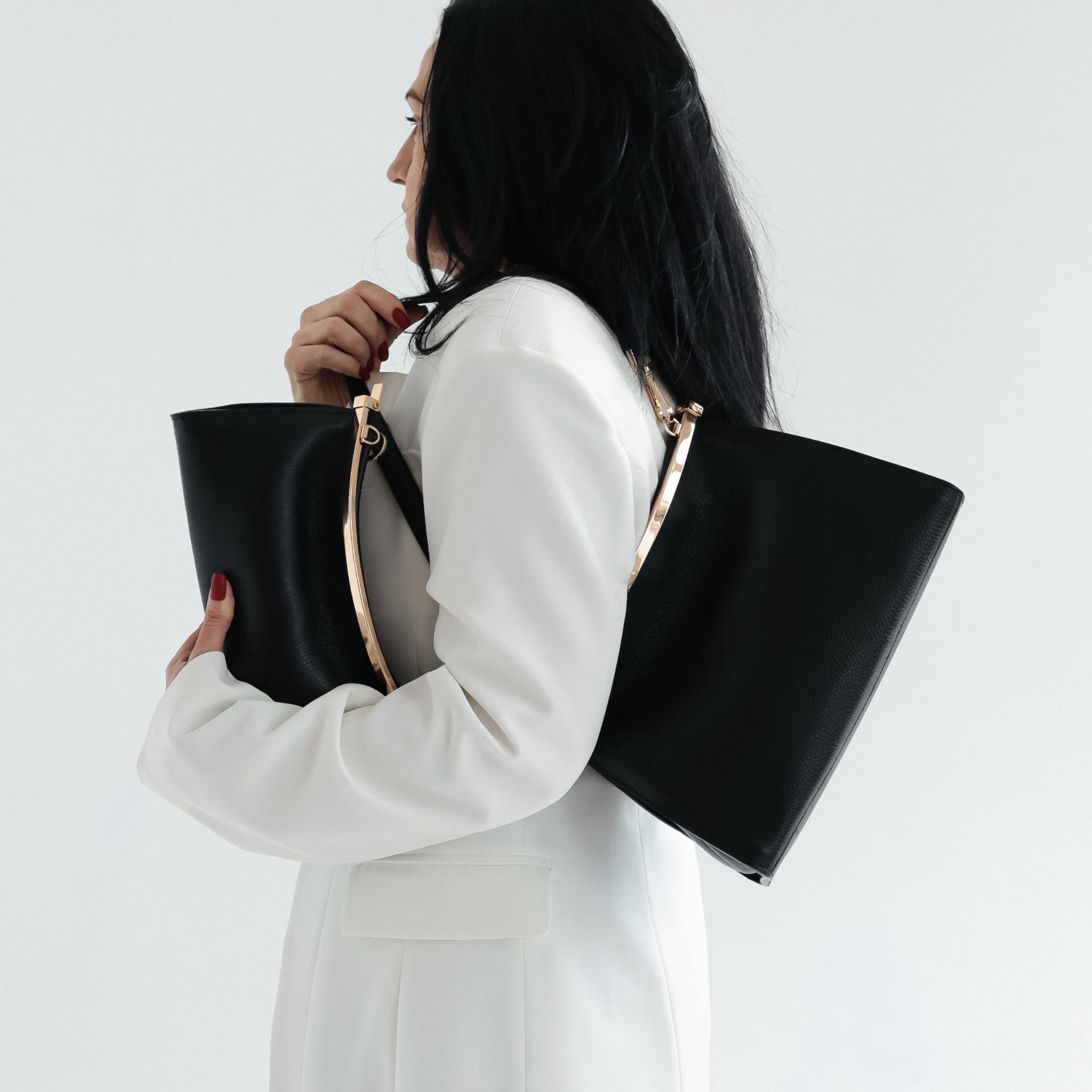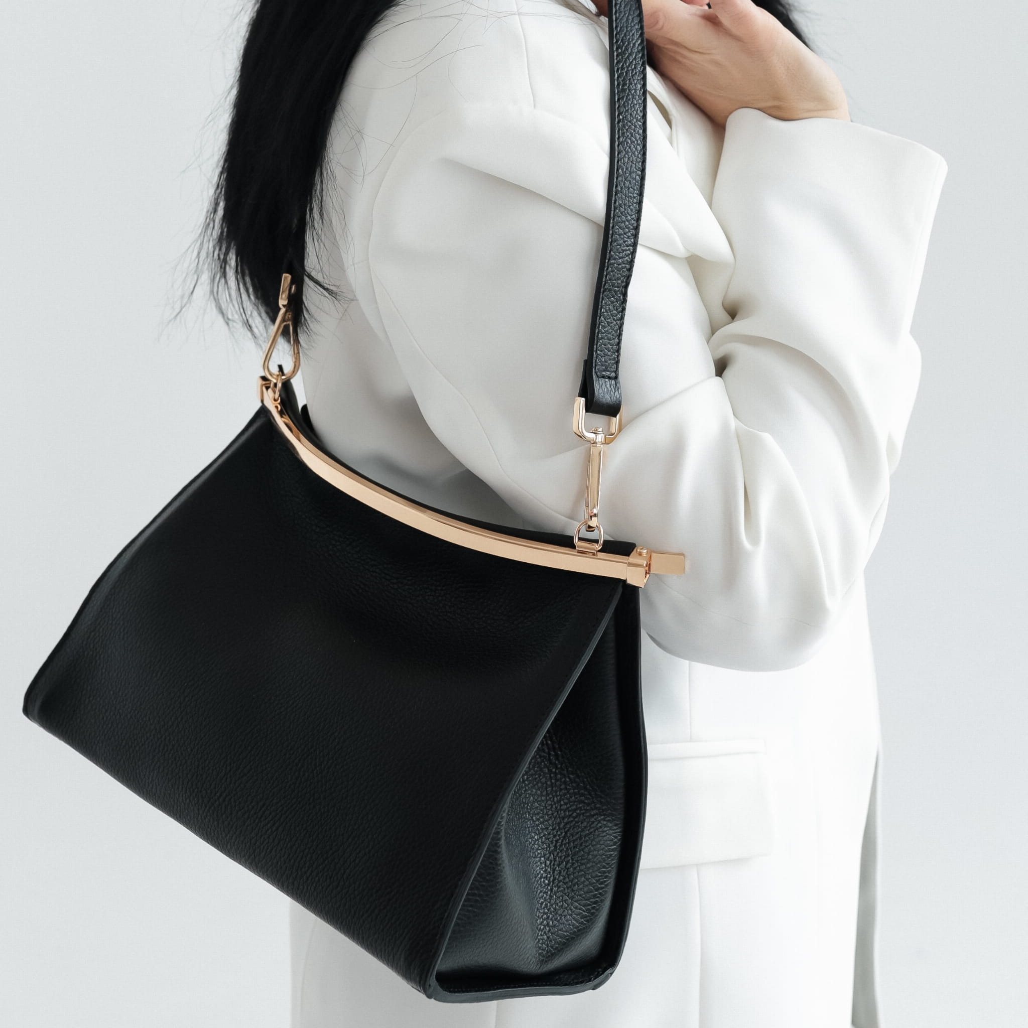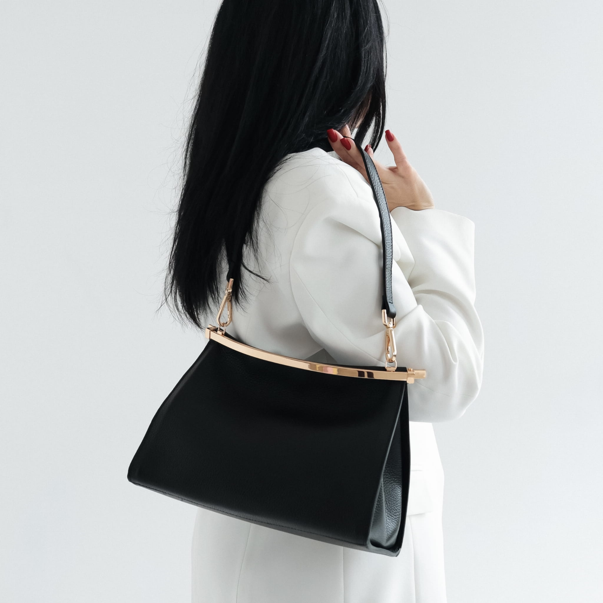 Torebka zamykana jest na metalową ramę, która porządkuje formę i wzmacnia konstrukcję. Model wyposażony jest w dwa odpinane paski: krótki, nieregulowany pasek do noszenia na ramieniu oraz długi pasek regulowany, który umożliwia noszenie na ramieniu lub przez ramię. Większy rozmiar sprawia, że torebka jest bardziej pojemna i lepiej sprawdza się podczas dłuższych wyjść, spotkań i wydarzeń.