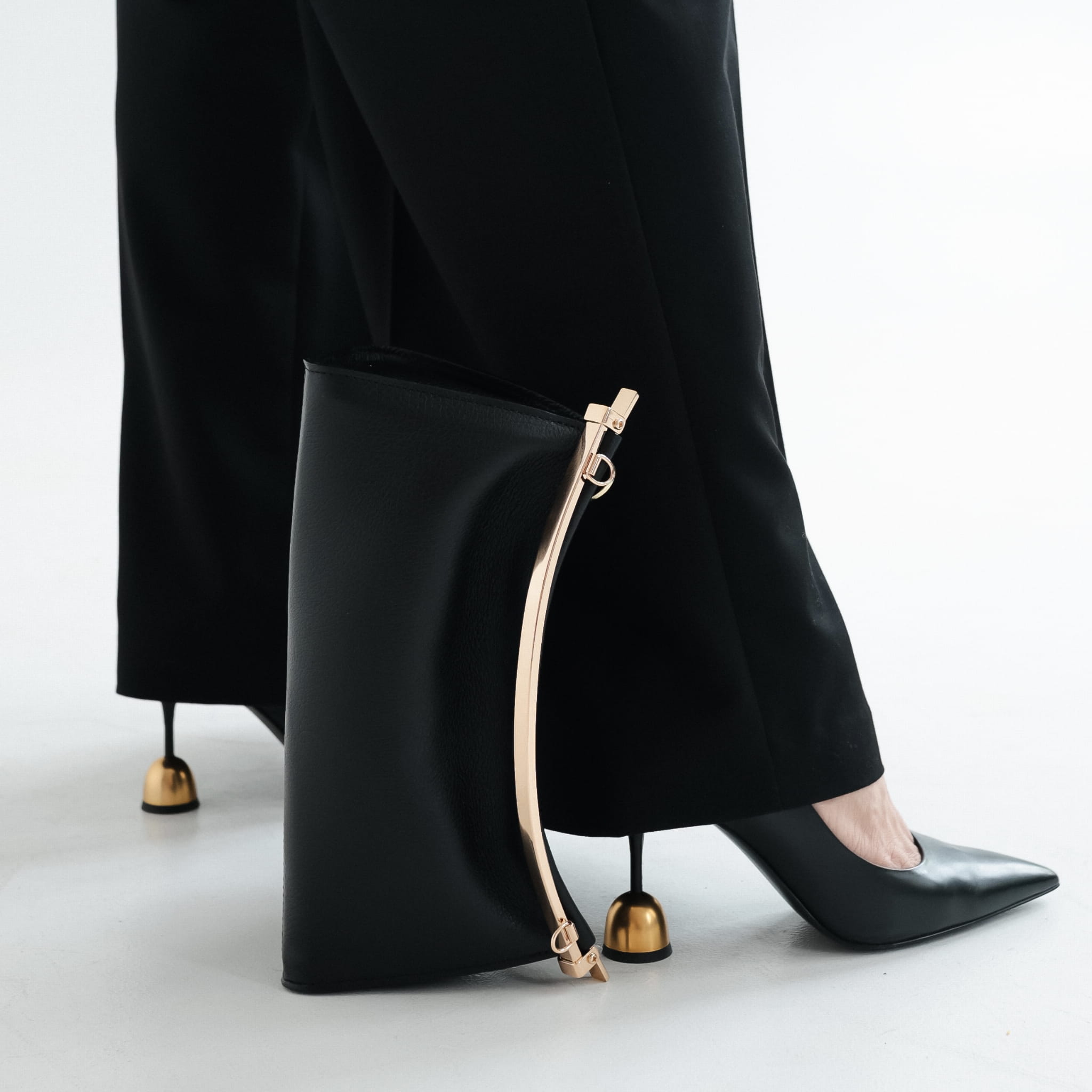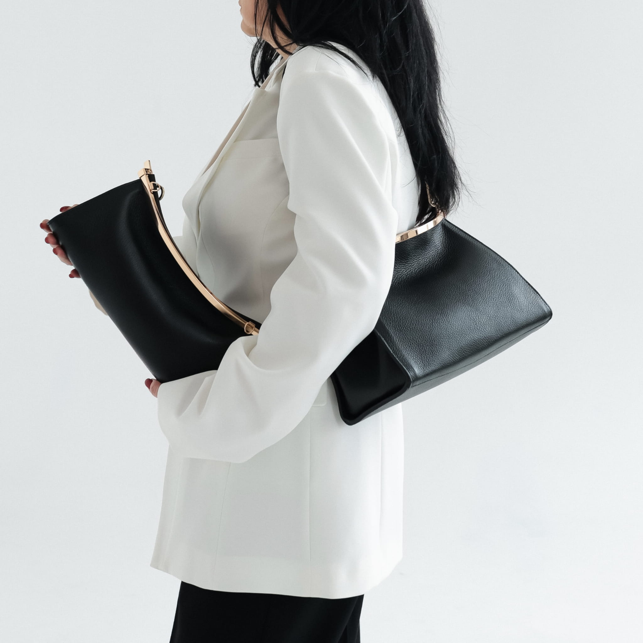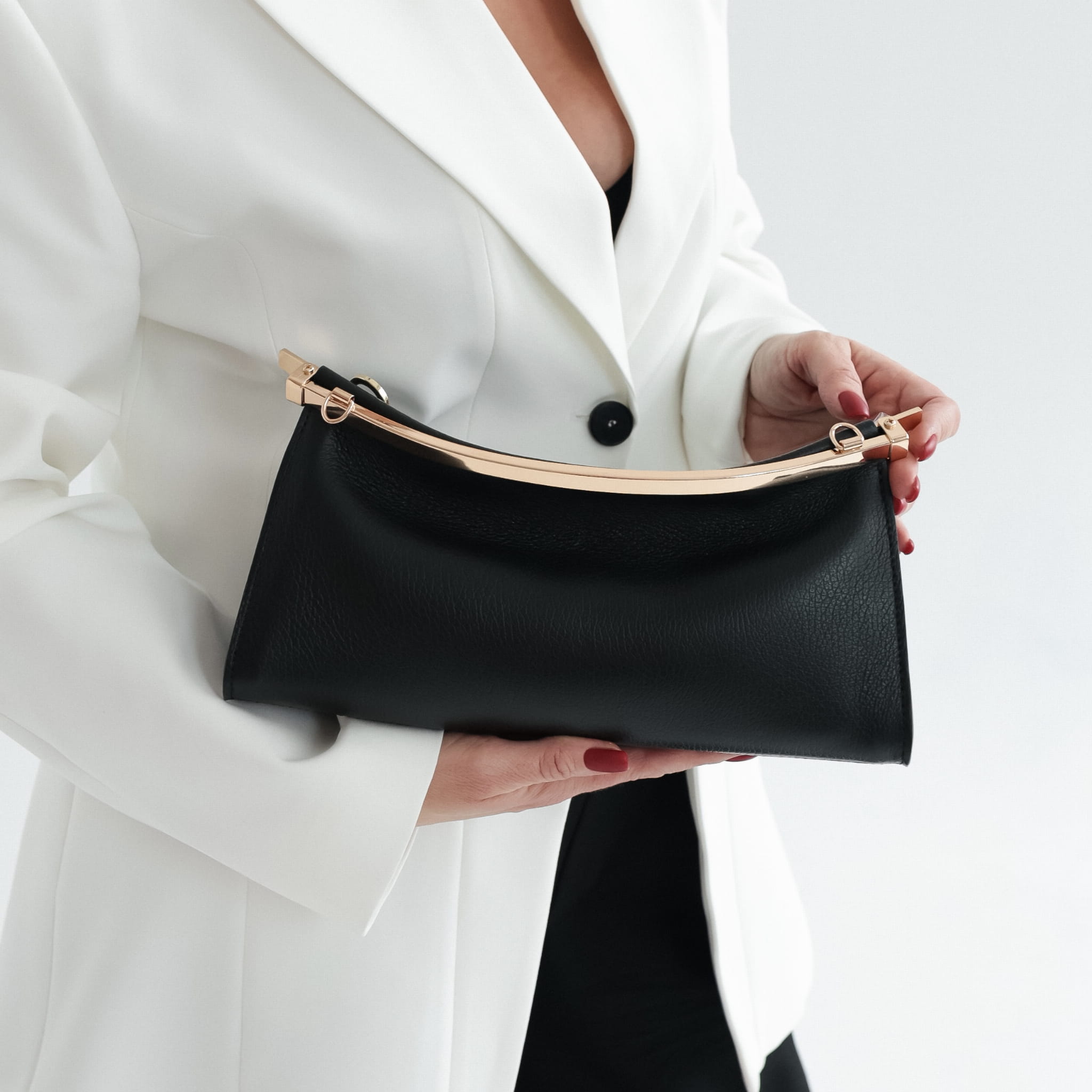 Model zamykany jest na metalową ramę, która nadaje torebce uporządkowaną, konstrukcyjną linię i pełni funkcję solidnego zamknięcia. Torebka posiada dwa odpinane paski: krótki pasek naramienny, nieregulowany, oraz długi pasek regulowany, umożliwiający noszenie na ramieniu lub przez ramię. Dzięki temu model może być noszony w ręce, na ramieniu lub crossbody, w zależności od sytuacji.