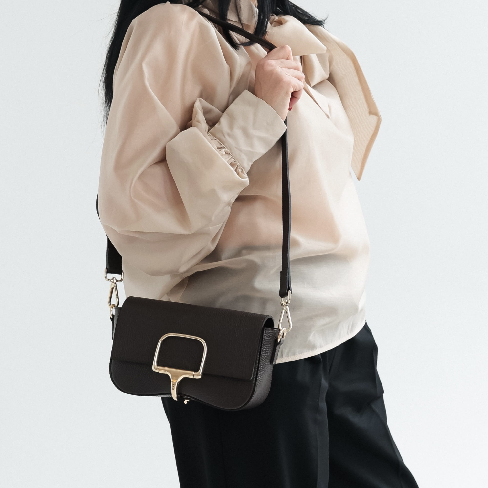 Złota kolorystyka okuć dodaje całości elegancji i luksusowego charakteru. Model wyposażony jest w regulowany skórzany pasek, dzięki czemu torebkę można nosić na ramieniu lub przez ramię, dopasowując ją do własnych potrzeb.