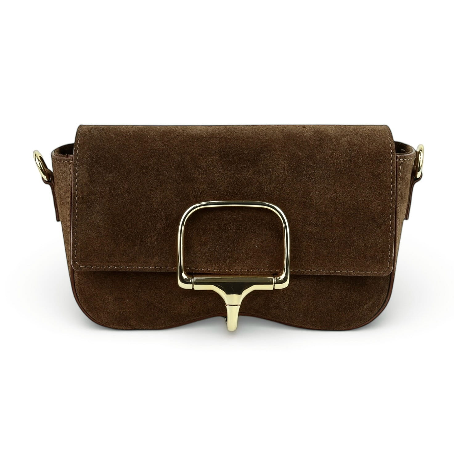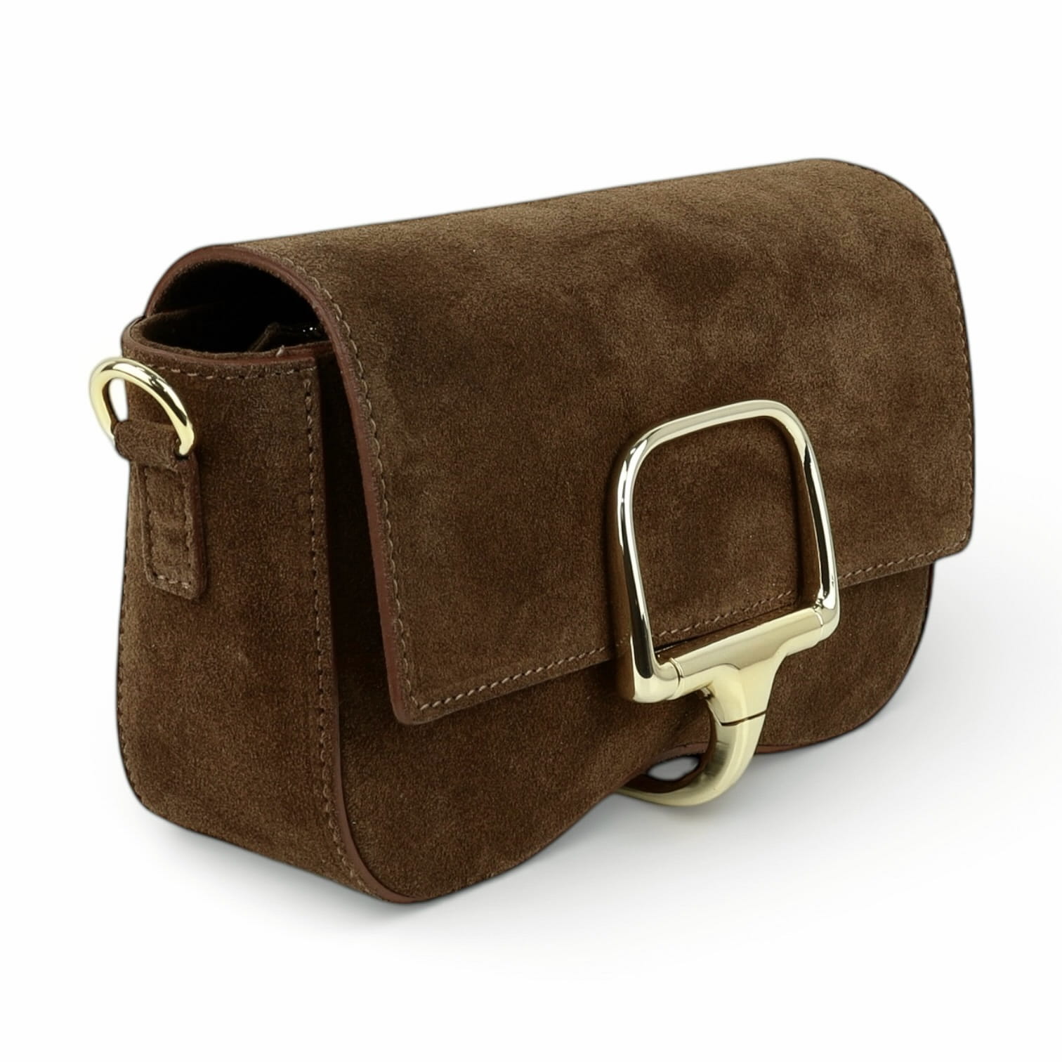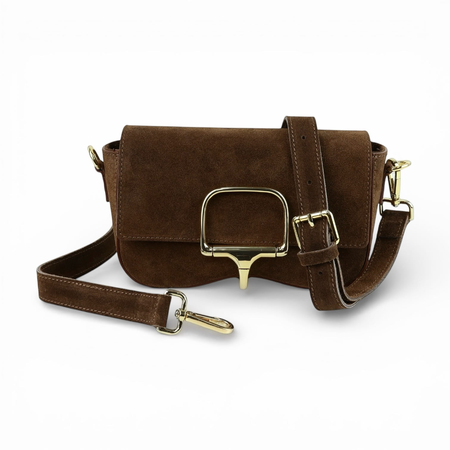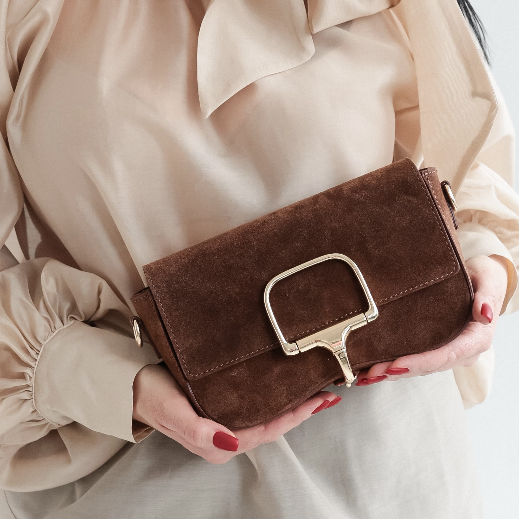 Elegancka włoska listonoszka damska z naturalnego zamszu – złote okucia.