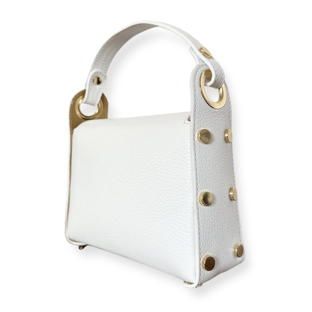 - Po bokach torebki okrągłe płaskie ćwieki złote które dodają torebce uroku i wyjątkowości.