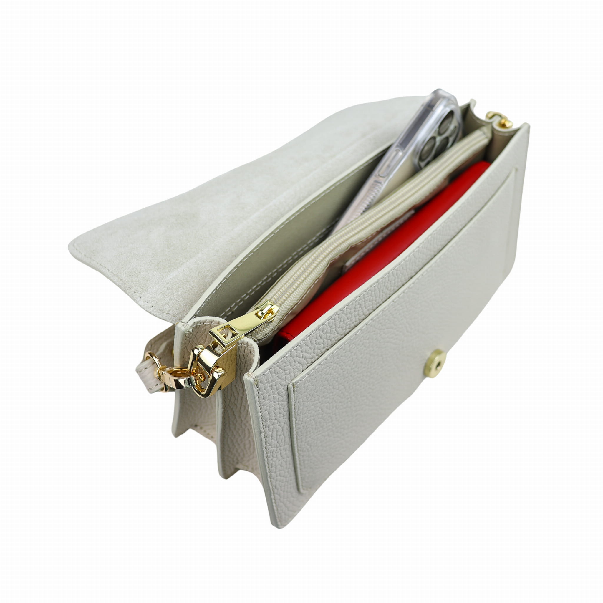 - Mieści duży portfel, okulary, telefon.