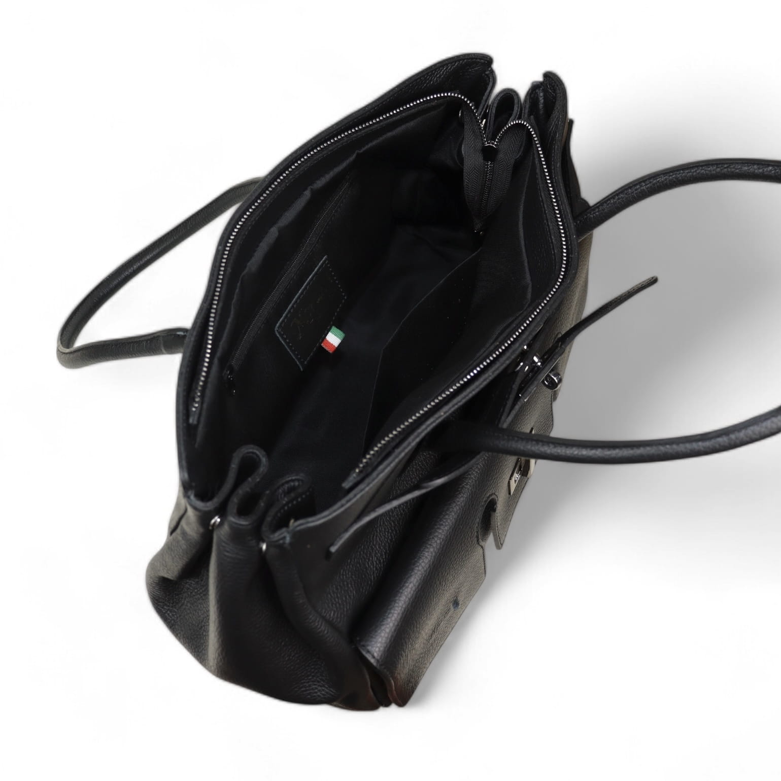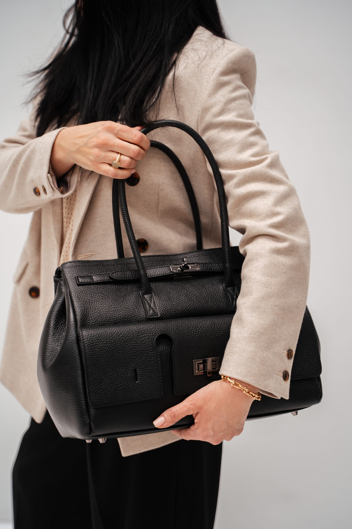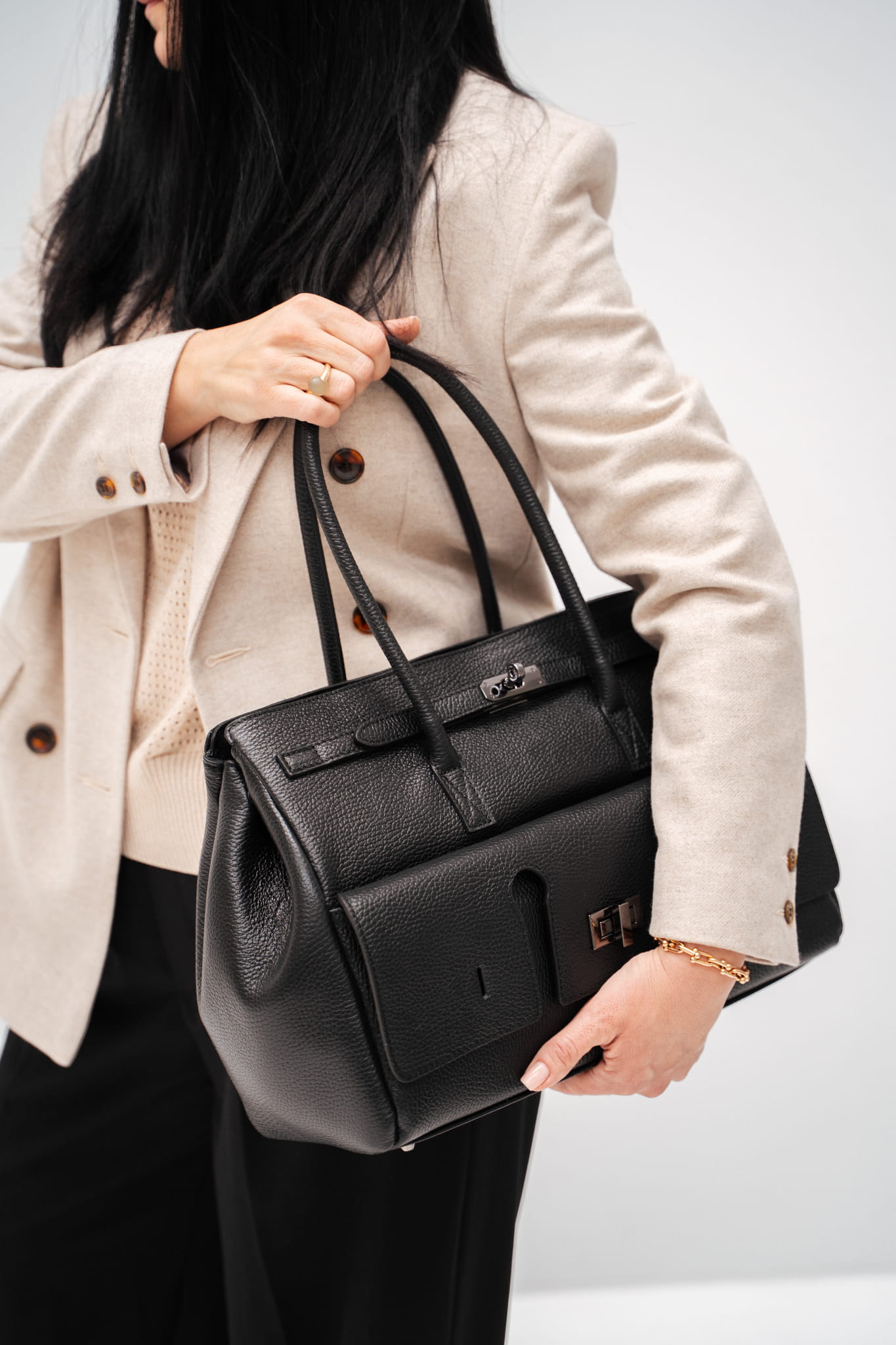 Dwa skórzane uchwyty do noszenia torby w ręku.