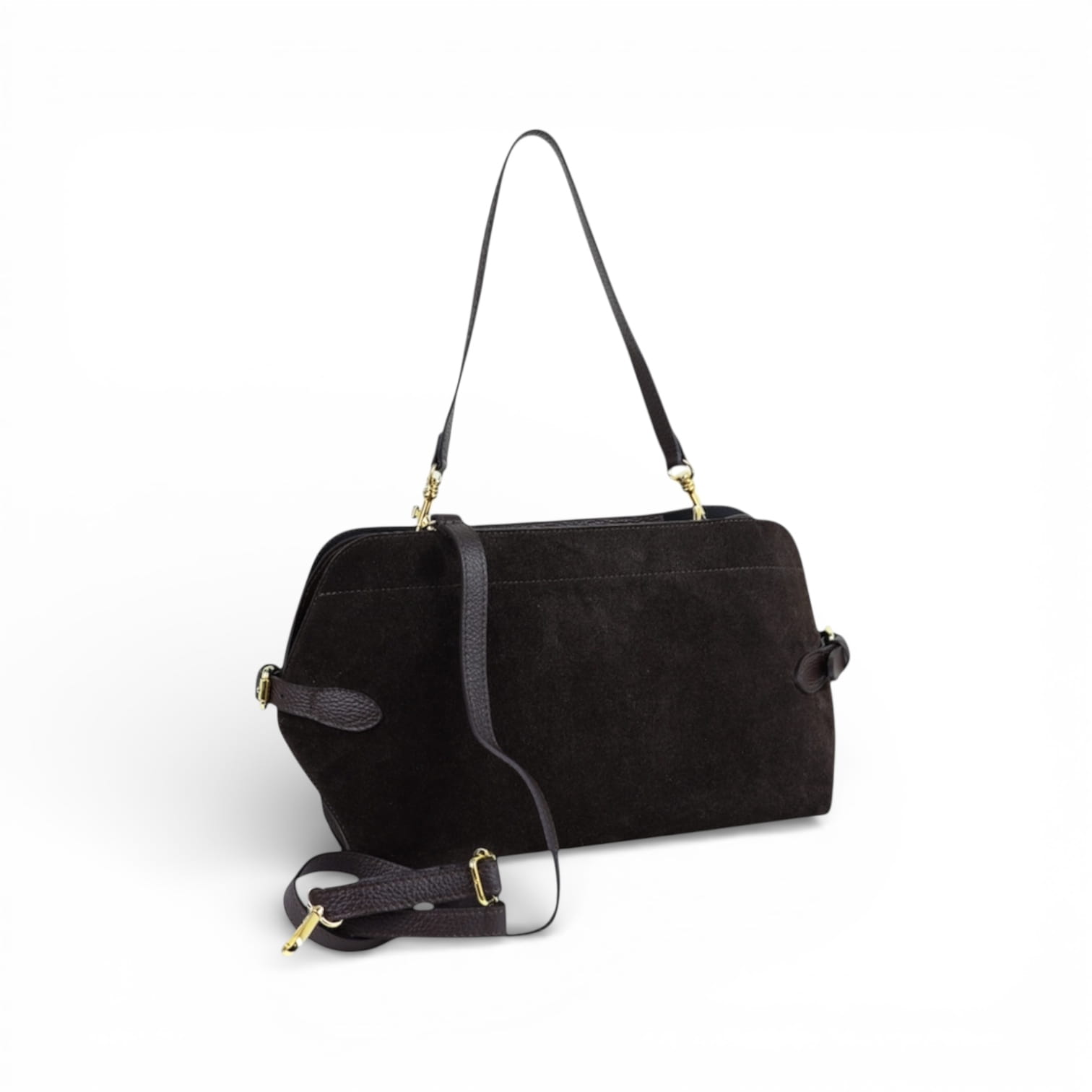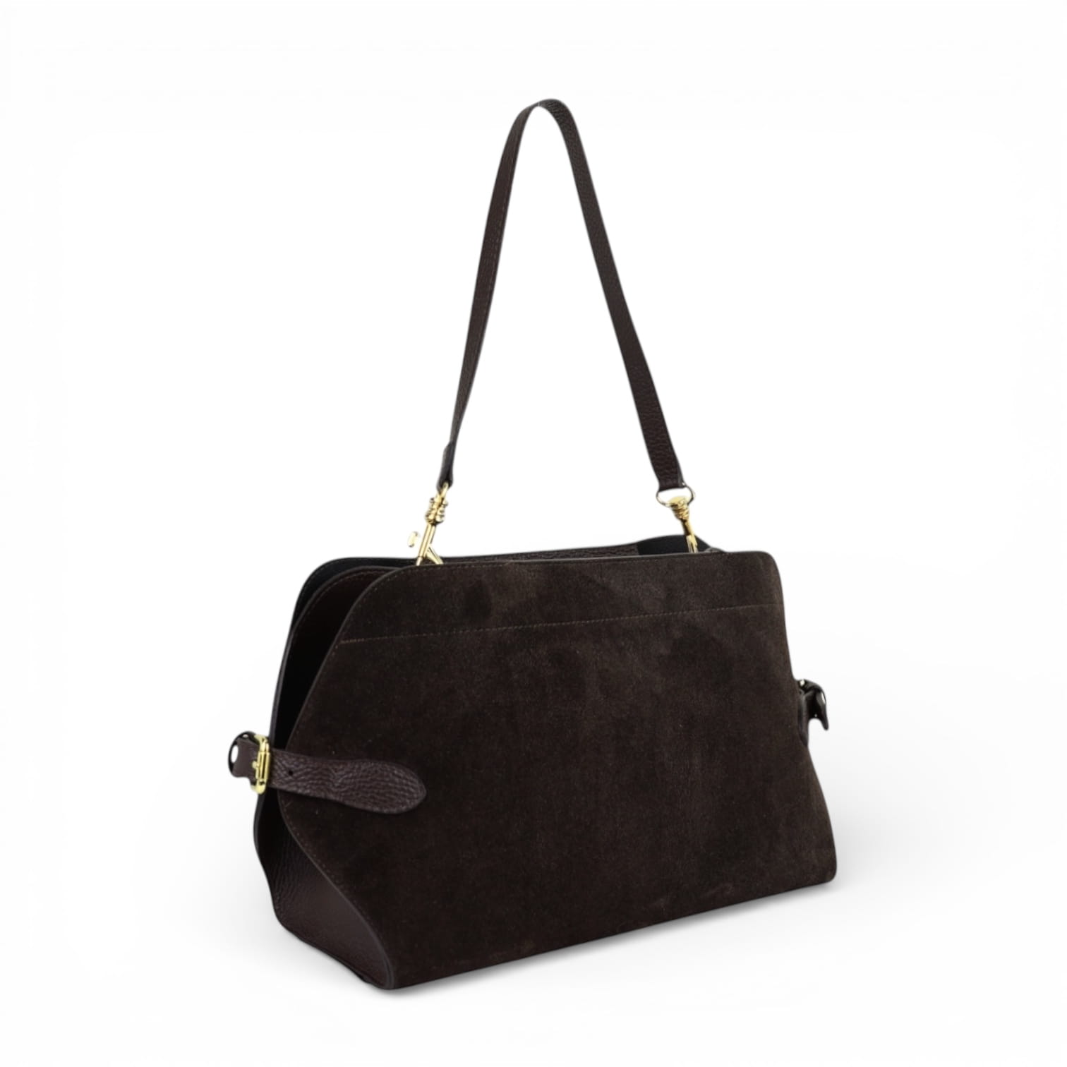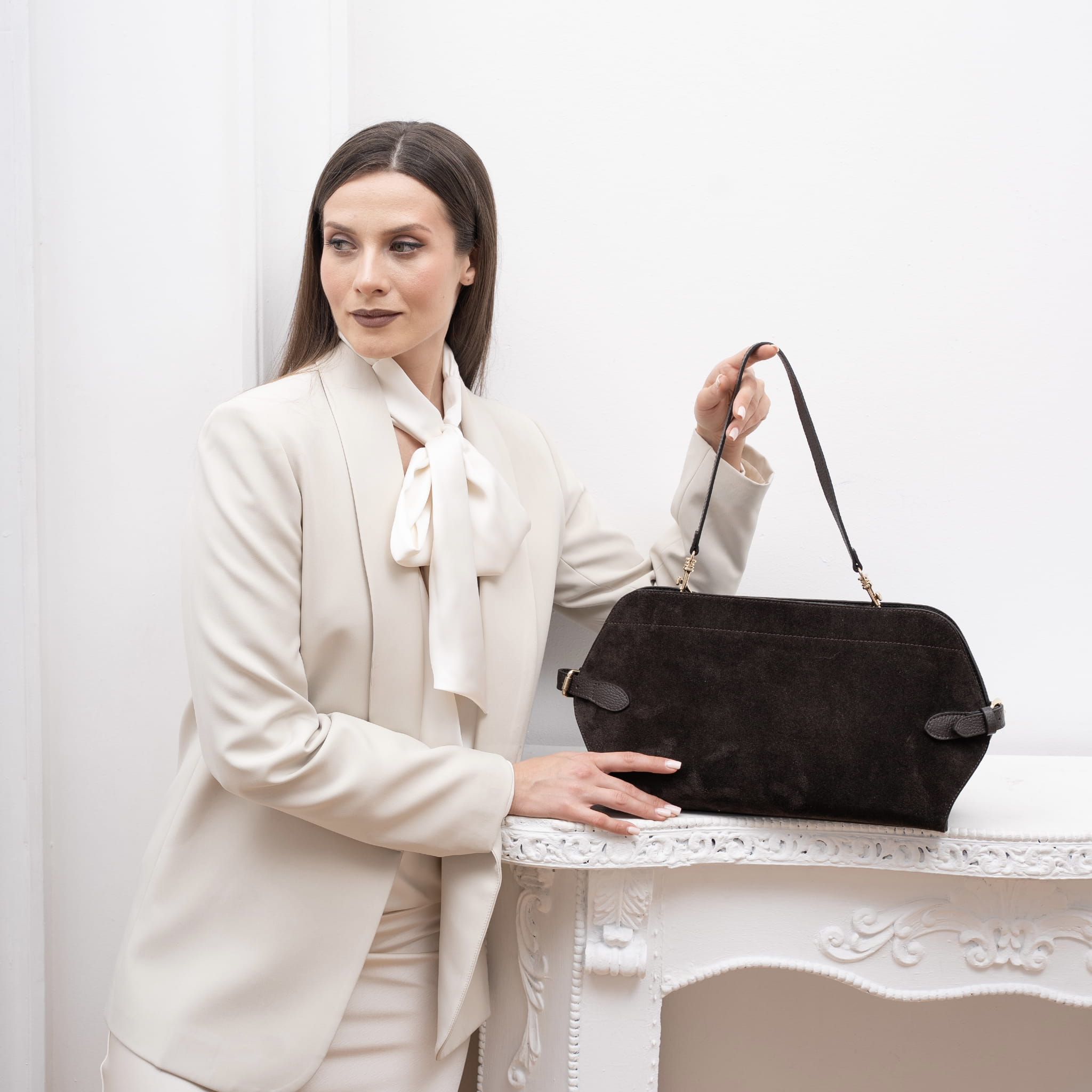 Stylowa damska torebka z naturalnego zamszu, uszyta we Włoszech, z elementami wysokiej jakości skóry naturalnej. Idealny wybór dla kobiet ceniących elegancję, jakość i ponadczasowy styl.
