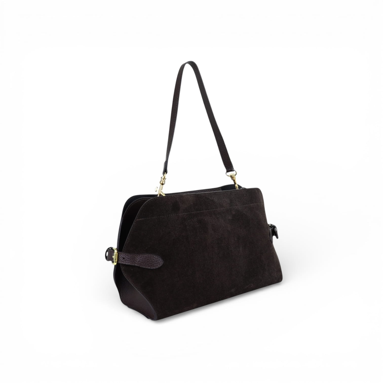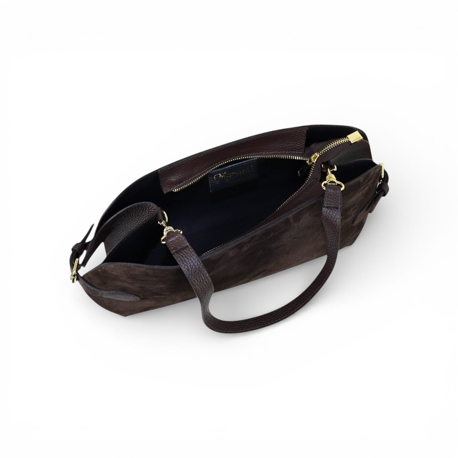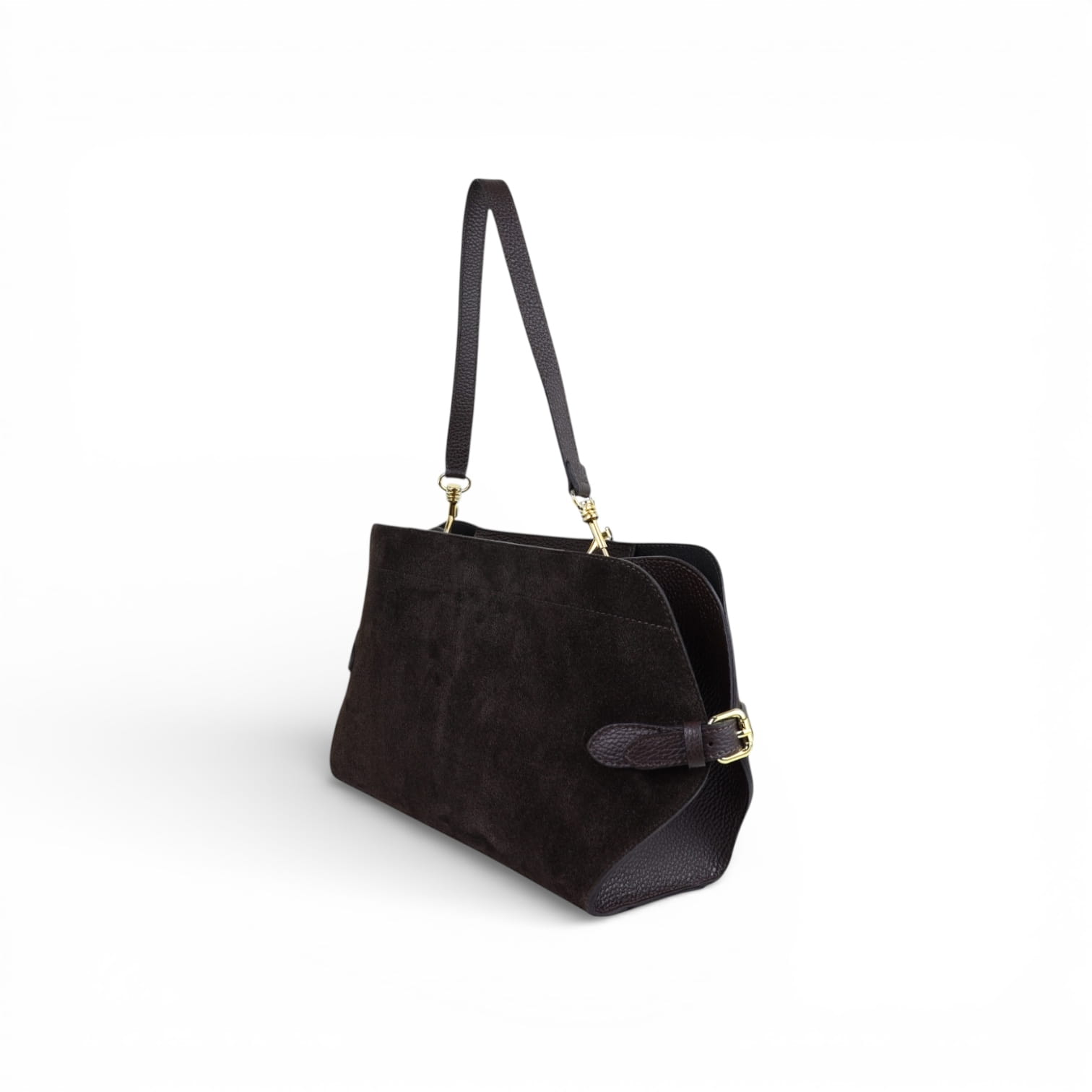 Stylowa damska torebka z naturalnego zamszu, uszyta we Włoszech, z elementami wysokiej jakości skóry naturalnej. Idealny wybór dla kobiet ceniących elegancję, jakość i ponadczasowy styl.